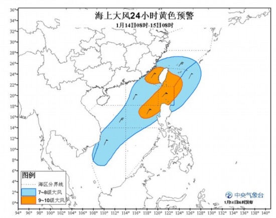 另外,海上大风仍旧强劲。中央气象台今晨继续发布海上大风黄色预警:预计未来24小时,台湾海峡、台湾以东洋面、巴士海峡、南海中东部海域将有9级、阵风10~11级的东北风,东海南部海域、南海东北部海域、南海中西部和西南部的部分海域将有7~8级、阵风9~10级的东北风。