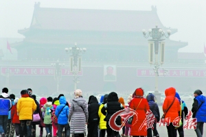 昨日,游客在雾霾笼罩下的北京天安门广场游览。新华社图