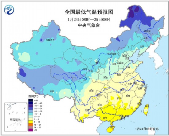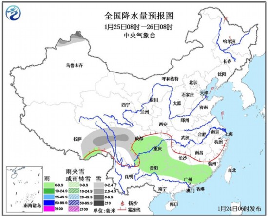 24日08时至25日08时,黑龙江东部、西藏南部和东北部的部分地区、山东半岛北部等地有小雪或雨夹雪,贵州西北部、山东半岛南部有小雨。内蒙古中东部、山东半岛有4~5级风。
