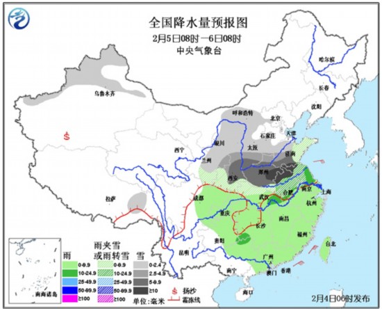 4日08时至5日08时,新疆西部、西北地区东部、华北西部和南部、黄淮西部、江汉北部、江淮北部等地有小到中雪或雨夹雪,其中,陕西中部、山西南部、河南西北部等地有大雪;四川盆地、江南、华南东部等地有小雨。江淮、江南北部等地有4~5级风,东海大部、台湾海峡、南海东北部有7~9级的风。