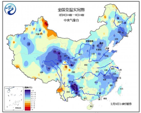 近日,在冷空气和雨雪天气的双重打压下,我国大部地区气温持续走低。今日14时,南北方地区气温相较昨日同时次普遍下降。其中,西北地区中部、云南贵州交界处等地降温最为明显,局地降幅超过8℃。