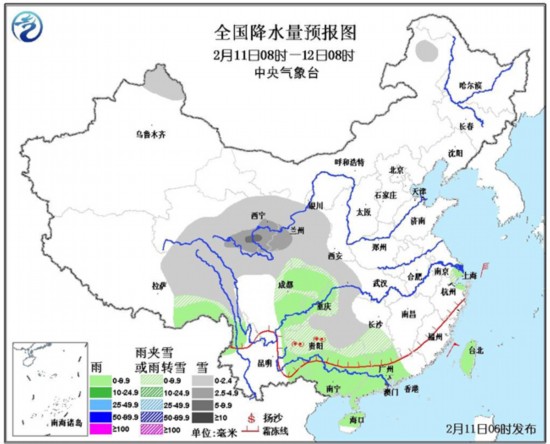 11日08时至12日08时,新疆北部、青藏高原中东部、西北地区东部、贵州、湖北西部、湖南南部和西部等地有小雪或雨夹雪,其中,青海东部、甘肃中部等地的部分地区有中到大雪;贵州中部的部分地区有冻雨;四川盆地、华南大部等地有小雨。东海大部、台湾海峡、南海中北部有7~8级、阵风9级左右的偏北到东北风。