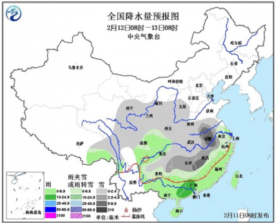 12日08时至13日08时,青藏高原东部、西北地区东部、华北西部、黄淮西部和南部、江汉、江淮、江南中西部、贵州等地有小到中雪或雨夹雪,其中,安徽中部、江西中部、湖南中部等地的部分地区有大到暴雪;贵州中部的部分地区有冻雨;四川盆地、江南东部和华南等地有小到中雨。东海大部、台湾海峡有7~8级、阵风9级的东北风。