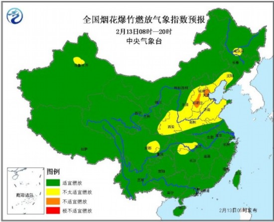 另外,在这场大范围降水天气来临之前,华北黄淮一带将受到雾和霾天气的袭扰,中央气象台提醒当地公众外出注意做好防护措施。今天白天到夜间,由于空气污染气象条件较差,华北黄淮一带普遍不太适宜燃放烟花爆竹。