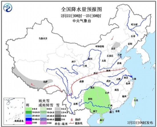22日08时至23日08时,西藏西南部等地有小到中雪,局部有大雪;贵州、广西、湖南西部、广东西部等地有小雨或阵雨,全国其他大部地区无明显降水。西藏中部有5、6级、阵风7、8级的偏西风。