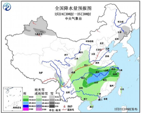 24日08时至25日08时,新疆北部、吉林东部和辽宁东部等地有小到中雪,其中新疆北部局地有大雪;西北地区东部、西南地区东部、江汉、江淮大部、江南大部、华南中西部等地有小到中雨或雨夹雪,其中湖北南部、安徽西南部、湖南北部、江西东北部等地的部分地区有大雨。