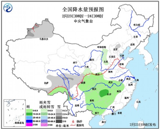 其中,预计今天白天到夜间,西藏东南部、西南地区东部、陕西南部、江汉、江淮西部、江南地区中西部、广西大部等地有小雨或阵雨,其中湖南中北部的部分地区有中雨。与此同时,新疆北部、西藏南部和东北部、川西高原北部、甘肃南部、山西西北部、河北北部等地有小到中雪或雨夹雪。另外,新疆西部等地还将有5至6级、阵风7至8级的西北风。