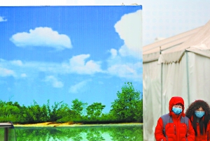 昨天,五棵松一集市门口摆放着大幅蓝天图片,连续的雾霾重度污染,广大市民都期盼着早日看到北京的蓝天。本报记者 戴冰摄