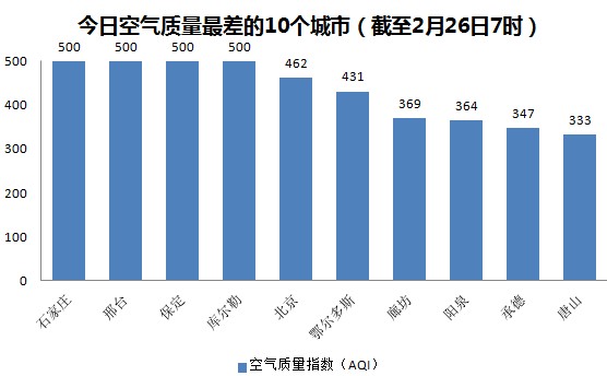 人民网北京2月26日电 (杨翼)根据环保部公布的最新数据,截至今天早上7时,石家庄、邢台、保定、库尔勒的AQI(空气质量指数)达到500,指数"爆表",属于六级严重污染,成为161个参与空气质量排名的城市中空气质量最差的城市。今日空气质量最差的10个城市分别是石家庄、邢台、保定、库尔勒、鄂尔多斯、北京、廊坊、阳泉、承德和唐山。其中北京AQI是462,属于严重污染,重霾目前依旧未散。
