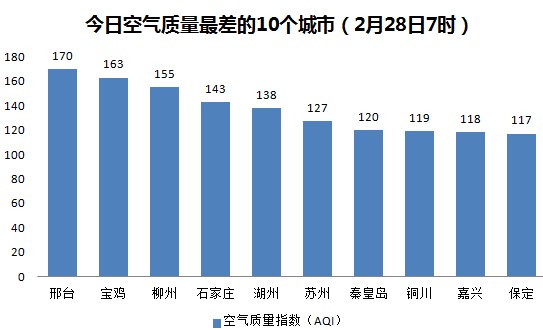 人民网北京2月28日电 (杨翼)今日全国空气普遍较好,根据环保部公布的最新数据,截至今天早上7时,邢台的AQI(空气质量指数)为170,属于中度污染,成为161个参与空气质量排名的城市中空气质量最差的城市。今日空气质量最差的10个城市分别是邢台、宝鸡、柳州、石家庄、湖州、苏州、秦皇岛、铜川、嘉兴和保定。今日全国无重度及以上污染,仅邢台、宝鸡和柳州等3城市有中度污染。