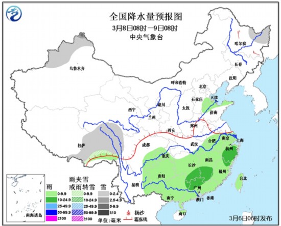 中国气象网讯 据中国气象台预报,3月6~8日,西南地区东部、江淮、江汉、江南、华南等地多阴雨天气,江南中北部、华南北部等地的部分地区有中雨,局部地区有大雨。