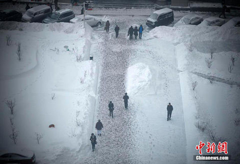 3月9日夜间到10日,新疆乌鲁木齐突降暴雪,路面积雪给行人出行造成不便。