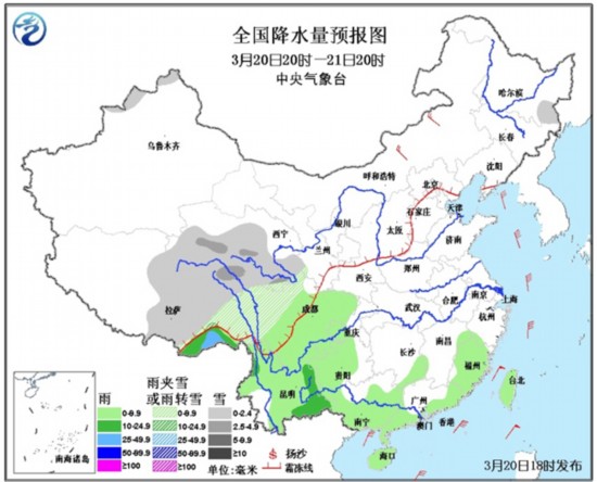 预计今天夜间到明天白天,江南东南部、湖南南部、广东南部、广西中南部、西南地区大部、西藏东南部等地有小到中雨,其中西藏东南部的部分地区有大雨。云南东南部局地还将有雷暴大风或冰雹天气,请上述地区的民众注意出行安全。另外,新疆西北部、青藏高原中东部等地有小到中雪或雨夹雪天气。