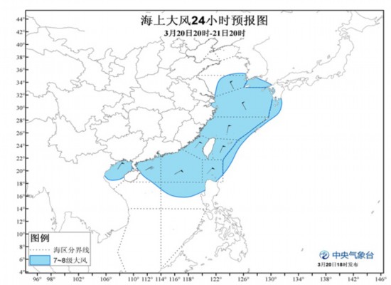 预计今日20时至明日20时,东海大部海域、台湾海峡、台湾以东洋面、巴士海峡、北部湾、南海北部和中东部海域将有7~8级、阵风9~10级的东北风,黄海南部海域将有7~8级、阵风9级的西北风转4~5级的西南风,黄海北部海域将有5~6级、阵风7级的西北风转4~5级的西南风,黄海中部海域将有6~7级、阵风8级的西北风转4~5级的西南风,琼州海峡、南海中西部海域将有5~7级的东北风,南海西南部海域将有4~6级的东北风。请在上述海域航行或作业的船舶注意航行安全。