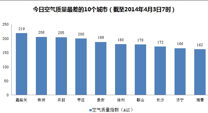 人民网北京4月3日电 根据环保部公布的最新数据,截至今天早上7时,嘉峪关的AQI(空气质量指数)达到219,属于重度污染,成为161个参与空气质量排名的城市中空气质量最差的城市。今日空气质量最差的10个城市分别是嘉峪关、株洲、开封、枣庄、泰安、徐州、鞍山、长沙、济宁和湘潭。