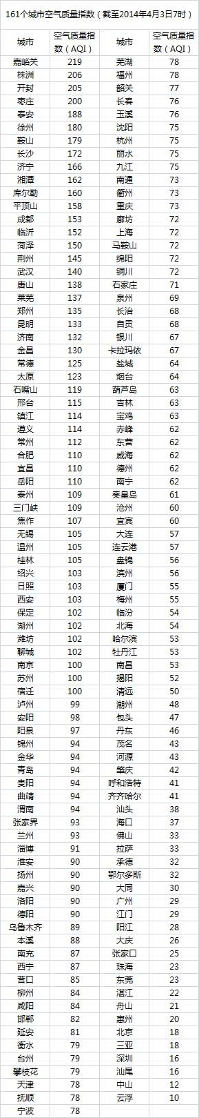 说明:自2014年1月1日起,环保部发布空气质量实时信息、空气质量月报及参与空气质量排名的地级城市已由74个增加到161个,包含了直辖市、省会城市、计划单列市、“三区”所有地级城市、环保重点城市和环保模范城市。人民网环保频道将采用环保部的官方数据,对161个城市每日空气质量进行排行。(实习生 朱宁君)