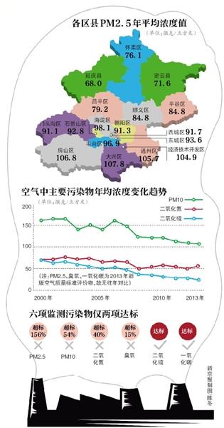 市环保局监测处处长刘贤姝介绍,2013年北京空气中PM2.5超标最为严重。