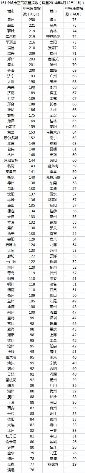 说明:自2014年1月1日起,环保部发布空气质量实时信息、空气质量月报及参与空气质量排名的地级城市已由74个增加到161个,包含了直辖市、省会城市、计划单列市、“三区”所有地级城市、环保重点城市和环保模范城市。人民网环保频道将采用环保部的官方数据,对161个城市每日空气质量进行排行。