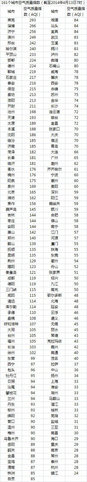 人民网北京4月13日电 (记者 杜燕飞)根据环保部公布的最新数据,截至今日早上7时,莱芜的AQI(空气质量指数)为293,属于重度污染,成为161个参与空气质量排名的城市中空气质量最差的城市。