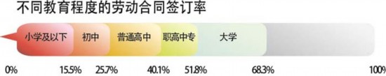 “流动大学毕业生劳动合同签订率相对较高;职高中专教育相对普通高中来说,在劳动力市场中更具优势,劳动合同签订率达到51.8%,比普通高中高出近12个百分点。教育程度越低,劳动合同签订率也越低,可见低端劳动力市场中劳动保障程度之低。”李强说。