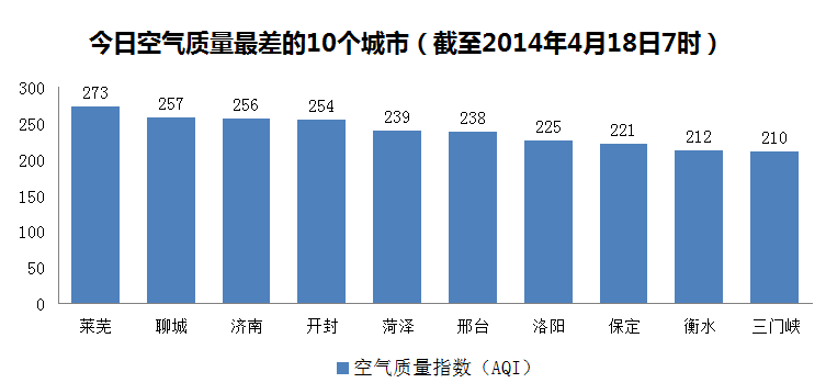 人民网北京4月18日电 根据环保部公布的最新数据,截至今天早上7时,莱芜的AQI(空气质量指数)达到273,属于重度污染,成为161个参与空气质量排名的城市中空气质量最差的城市。今日空气质量最差的10个城市分别是莱芜、聊城、济南、开封、菏泽、邢台、洛阳、保定、衡水和三门峡。此外,连同淄博和郑州共12城重度污染。