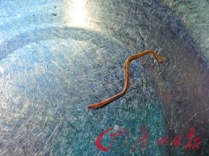 谢先生告诉记者,昨日起床后,准备洗漱之时,却在厕所的水桶里,发现了一条蠕动的细长的虫子。