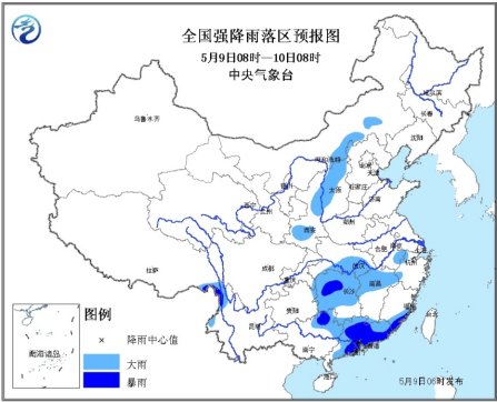 人民网北京5月9日电 (杨翼)今晨6时,中央气象台继续发布暴雨蓝色预警。本周末,受北方冷空气和南方暖湿气流的共同影响,我国中东部大部地区都将出现一次明显的降雨过程,对大家的外出游玩会产生不利影响。