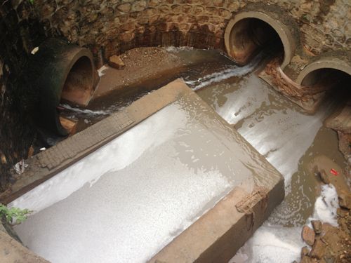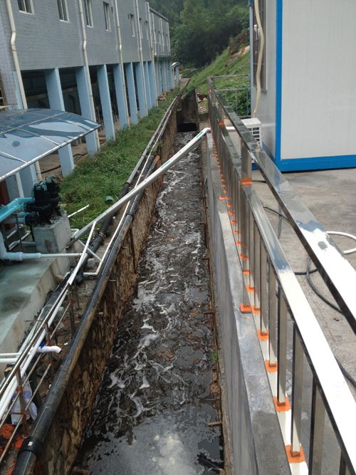 在地面上,沿着沟渠没入地下的方向行走约30米后,记者发现一个直径五米左右的圆形竖井,井底部分别有两个入水口,两个出水管;其中一个入水口方向与记者此前查寻的沟渠相符,入水性状也相符,进入竖井后,直接流向出水管;经过查寻,另一个入水口来自于距此不远的一处涵洞,水源是山上雨水,夹带大量杂物,泛着泡沫,进入竖井后,经由一个方形水泥池后溢流而出,流向出水管。