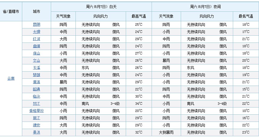人民网北京6月5日电(蒋琪)据中央气象台最新消息,高考第一天(6月7日)与云南省多地天气有中到大雨,普洱暴雨,提醒考生和家长注意出行。