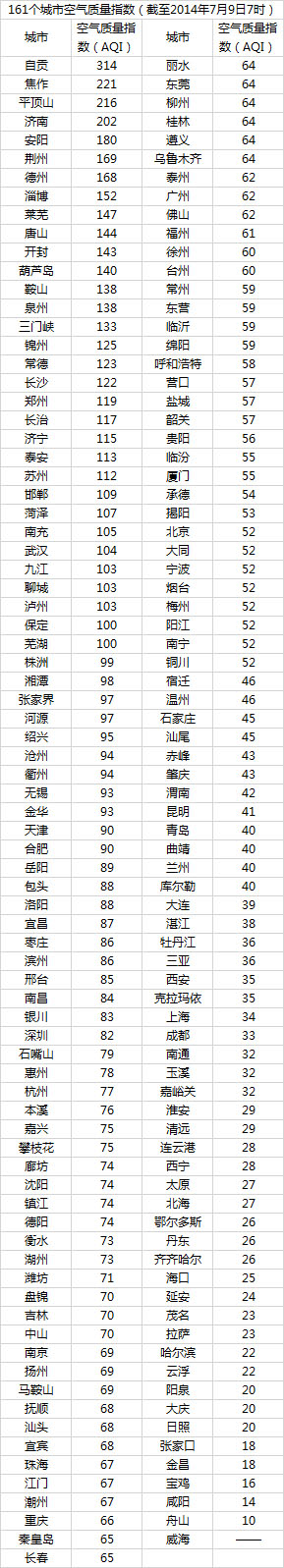 人民网北京7月9日电 (记者蒋琪)根据环保部公布的最新数据,截至今日早上7时,自贡的AQI(空气质量指数)为314,属于六级严重污染,成为161个参与空气质量排名的城市中空气质量最差的城市。今日空气质量最差的10个城市分别是自贡、焦作、平顶山、济南、安阳、荆州、德州、淄博、莱芜、唐山。其中自贡、焦作、平顶山、济南等4个城市是重度及以上污染。