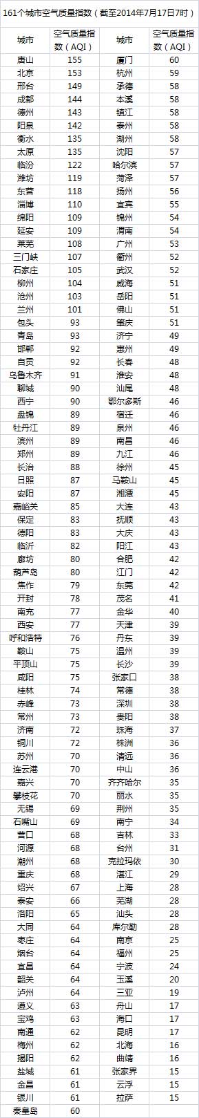 说明:自2014年1月1日起,环保部发布空气质量实时信息、空气质量月报及参与空气质量排名的地级城市已由74个增加到161个,包含了直辖市、省会城市、计划单列市、“三区”所有地级城市、环保重点城市和环保模范城市。人民网环保频道将采用环保部的官方数据,对161个城市每日空气质量进行排行。