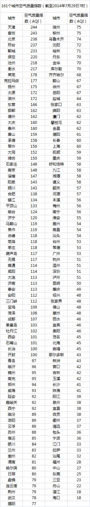 说明:自2014年1月1日起,环保部发布空气质量实时信息、空气质量月报及参与空气质量排名的地级城市已由74个增加到161个,包含了直辖市、省会城市、计划单列市、“三区”所有地级城市、环保重点城市和环保模范城市。人民网环保频道将采用环保部的官方数据,对161个城市每日空气质量进行排行。