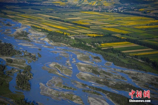 8月3日,记者乘坐动力三角翼从新疆特克斯县周边的山顶起飞,从空中俯拍世界最大规模的八卦城。来自全国各地的飞行爱好者们正在此地参加由特克斯县天翼航空俱乐部组织的飞行嘉年华活动,今后到此旅游的游客可从空中俯览最大规模八卦城的壮观景象。据介绍,特克斯县根据《周易》八卦“后天图”方位设计建成,路路相通,街街相连,有着神奇迷宫般的街道布局,是现今世界上唯一一座保存良好、卦爻完整、规模最大的八卦城。刘新 摄
