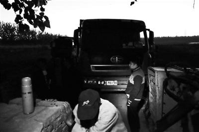 三辆倾倒垃圾的卡车被截留在村里,6位村民仍守在一处倾倒垃圾的场地边。“没有人在,他们又来倒垃圾怎么办?”一位村民表示。