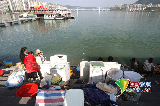 三峡工程175米蓄水后,重庆万州不少市民趁着江水上涨后带来的便利,纷纷带着脏衣物、床单、被褥等到长江边清洗,洗衣者成群结队有时扎堆上百人,更有精明的生意人搬来洗衣机和洗涤用具在此长期出租。洗衣机的污水排放口直接插入长江,肥皂泡沫、污渍、污水等混注长江,给库区长江水质带来污染,已成为一道不雅的“风景”。