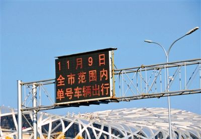 APEC会议期间,北京实行单双号限行。11月9日,鸟巢旁道路的LED屏幕上打出机动车出行提示。图/CFP