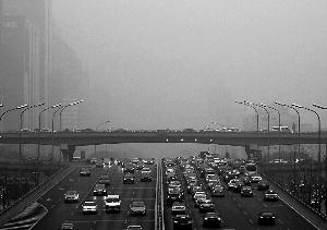 昨日早高峰雾霾下的长安街。晨报记者 王巍/摄