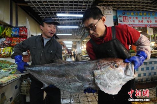 12月14日,一条长1.46米,重100余斤的“怪鱼”被摆上青岛市一家野生鱼专卖店摊档,很多市民围观这条“怪鱼”却无人认识,连多年从事捕鱼的渔民也叫不上名字。据了解,12日凌晨,胶州渔民在渤海湾收网时捕获到这条大鱼,同时还捕获到一条罕见的重约20斤的鸦片鱼。由于不知大鱼的名字,也无法定价,目前这条大鱼仍“暂存”在这家野生鱼专卖店里。中新社发王海滨摄图片来源:CNSPHOTO