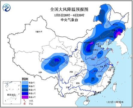 人民网北京1月5日电 (蒋琪)中央气象台1月5日18时继续发布寒潮蓝色预警:受强冷空气影响,预计5日20时至7日20时,我国中东部大部地区将先后出现大风降温天气,气温普遍下降6~10℃,其中,内蒙古东北部、华北北部和西部、辽宁北部、吉林中东部以及江汉、江南西部等地降温幅度可达10~12℃,局地可超过14℃;上述地区并伴有4~6级偏北风,江河湖面风力可达5~7级。渤海、黄海将有7~8级大风,阵风9级。另外,青藏高原东部气温也将下降6~10℃,局部降温10~12℃。