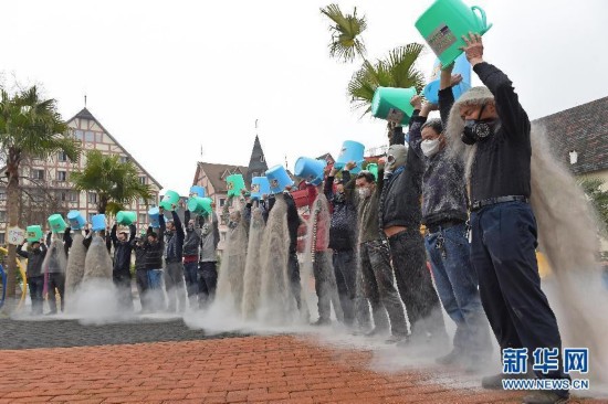3月1日,在重庆市美心红酒小镇景区,20多名沙桶挑战者将河沙从头顶倒下来,以宣传环境保护。新华社记者 陈诚 摄图片来源:新华网