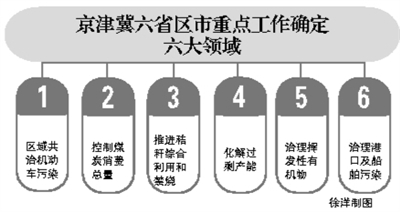 京津冀及周边地区大气污染防治协作小组第四次会议近日通过了《京津冀及周边地区大气污染联防联控2015年重点工作》(以下简称《重点工作》),明确表示京、津、冀、晋、鲁、内蒙古六省区市将在机动车污染治理、煤炭消费总量控制、秸秆综合利用和禁烧、化解过剩产能、挥发性有机物治理、港口及船舶污染治理六大重点领域协同开展工作。