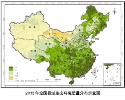 2013年,全国生态环境质量总体“一般”。2461个县域中,“优”、“良”、“一般”、“较差”和“差”的县域分别有558个、1051个、641个、196个和15个。生态环境质量为“优”和“良”的县域占国土面积的46.7%,“一般”的县域占23.0%,“较差”和“差”的县域占30.3%。