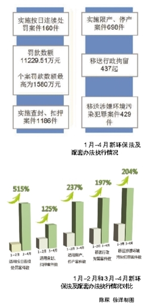 本报记者王昆婷北京报道 环境保护部近日向媒体通报了新环保法及配套办法的执行情况。新环保法实施以来,环保部门充分运用按日连续处罚、查封扣押、限产停产以及移送行政拘留等手段,执法力度日益加大,同时加强与司法机关联动,积极推进两法衔接。与1月~2月相比,3月~4月适用按日连续处罚案件数上升515% ,适用查封、扣押案件数上升125%,适用限产、停产案件数上升237%,移送行政拘留案件数上升197%,移送涉嫌环境污染犯罪案件数上升204%。