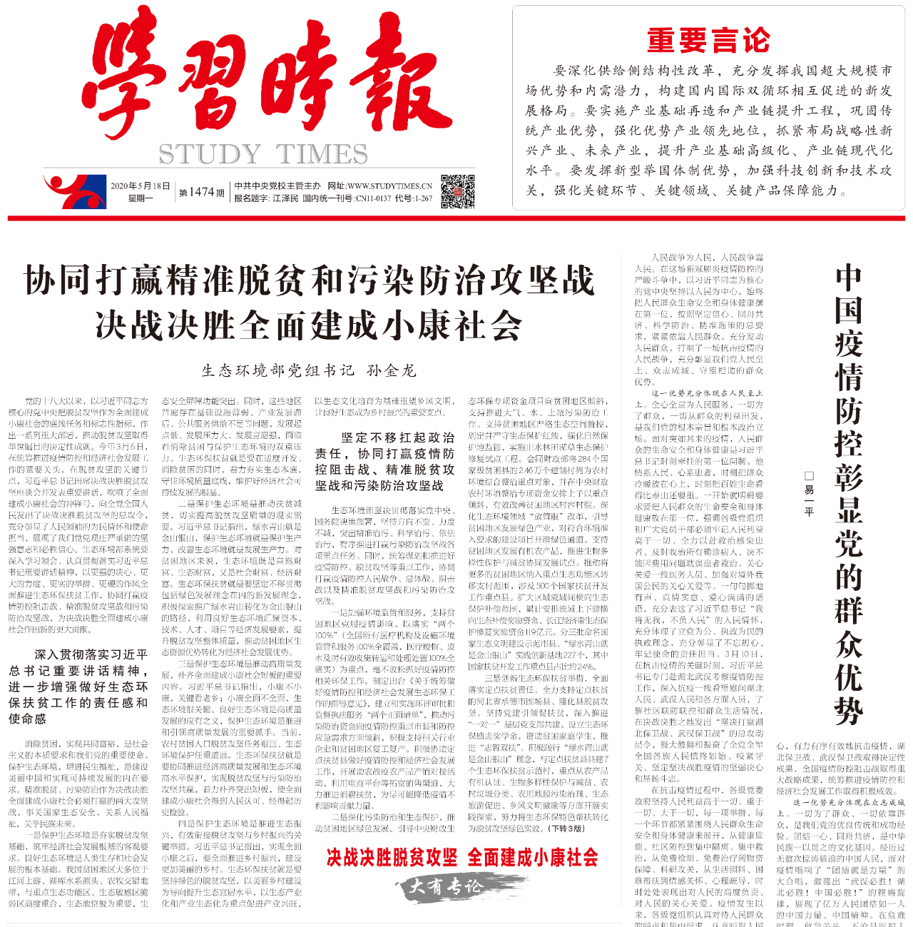 生态环境部党组书记在《学习时报》发表署名文章:协同打赢精准脱贫和污染防治攻坚战决战决胜全面建成小康社会