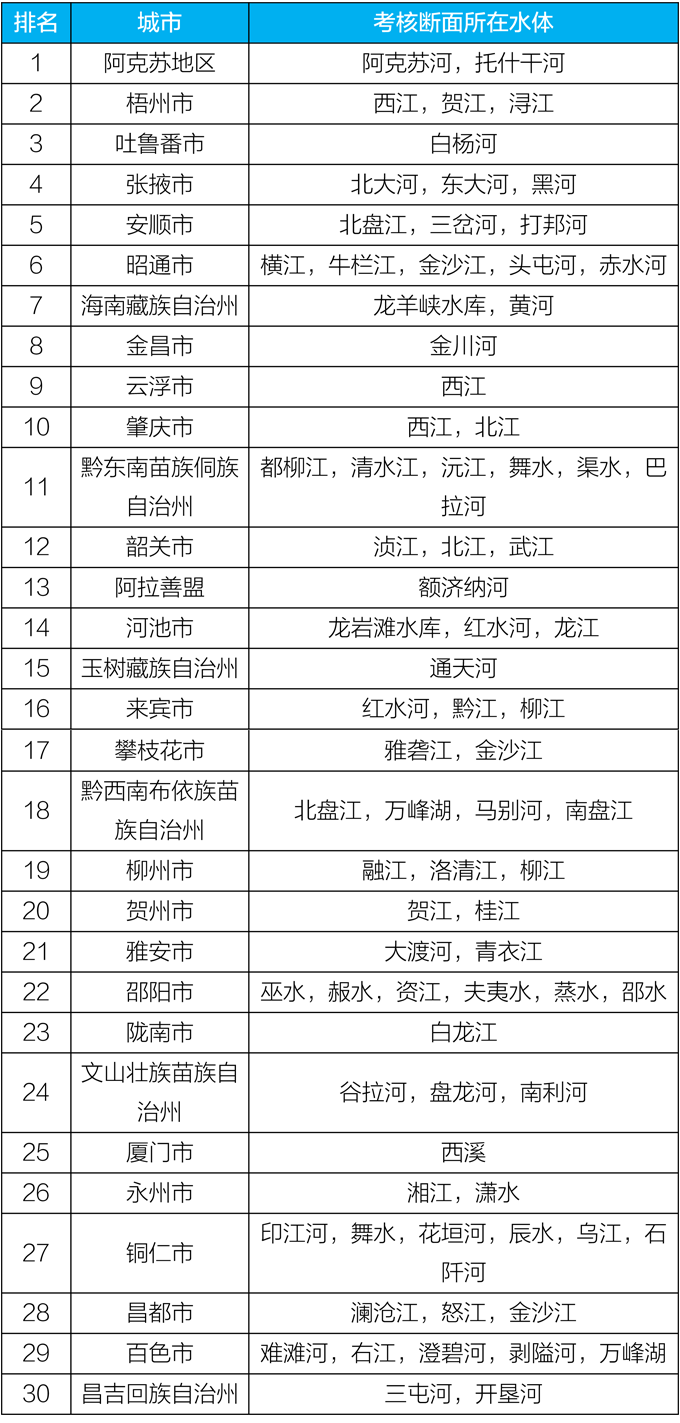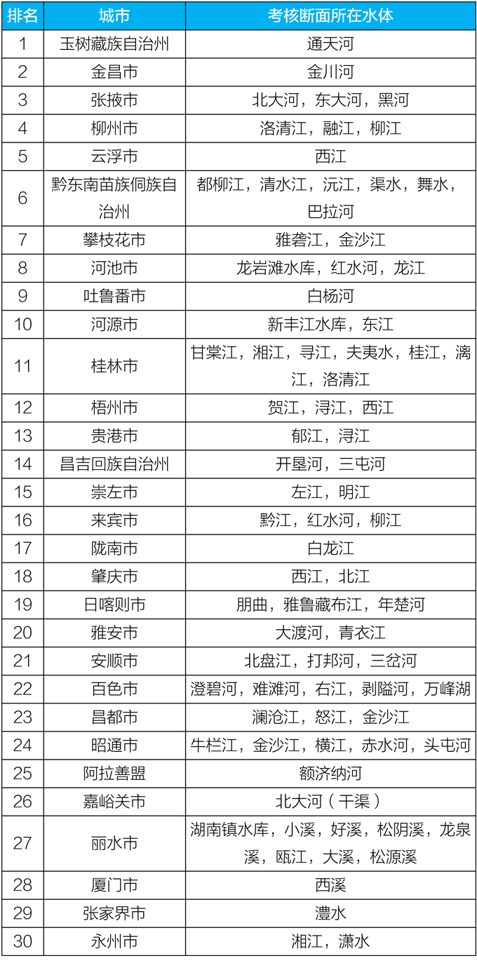 2020年5月国家地表水考核断面水环境质量状况排名前30位城市及所在水体