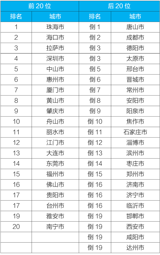 5月,168个重点城市中唐山、成都、德阳市等城市空气质量相对较差(从倒数第1名至并列倒数第19名);珠海、海口、拉萨市等城市空气质量相对较好(从第1名至第20名,见附表5)。