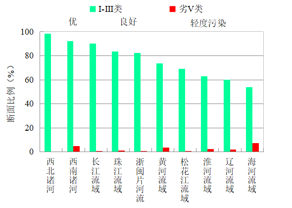 1-5月,长江、黄河、珠江、松花江、淮河、海河、辽河等七大流域及西北诸河、西南诸河和浙闽片河流Ⅰ-Ⅲ类水质断面比例为84.4%,同比上升6.6个百分点;劣Ⅴ类为1.1%,同比下降4.1个百分点。主要污染指标为化学需氧量、高锰酸盐指数和氨氮。其中,西北诸河、长江流域、浙闽片河流、西南诸河和珠江流域水质为优,黄河和淮河流域水质良好,松花江、海河和辽河流域为轻度污染。