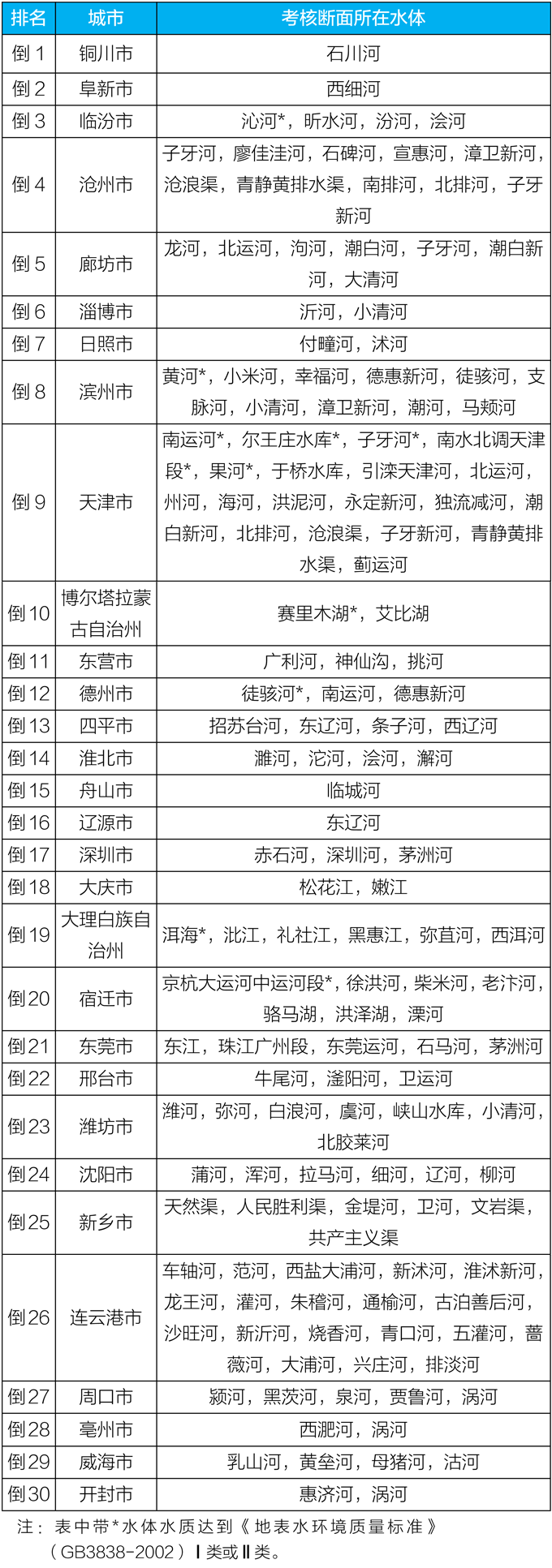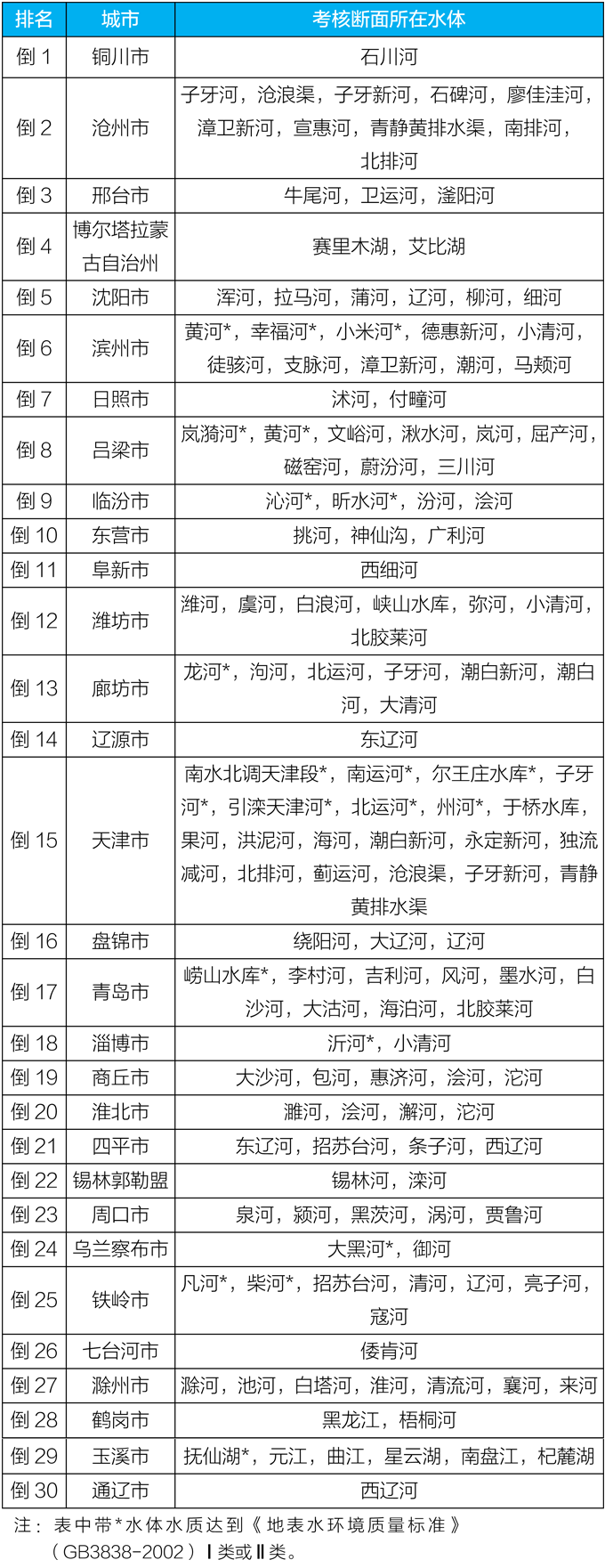 地级及以上城市国家地表水考核断面排名