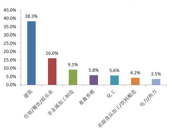 从行业类型来看,11月公众反映最集中的行业为建筑业,占38.3%;其次为住宿餐饮娱乐业和非金属加工制造业,分别占16.0%和9.1%。其中,建筑业占比比10月同类占比减少2.6%;住宿餐饮娱乐业举报占比比10月同类占比增加0.9%,非金属加工制造业举报占比与10月同类占比持平。