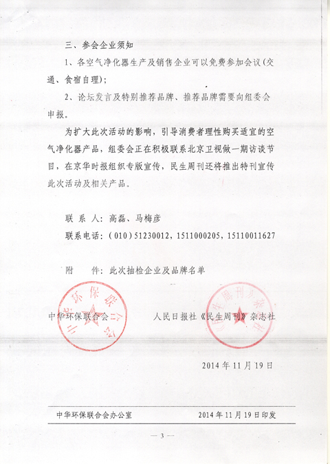 为扩大活动的影响面,拟于2014年12月中下旬在北京组织召开“空气净化器第三方检测结果新闻发布会暨首届空气净化器行业论坛”。具体内容见附件发文。